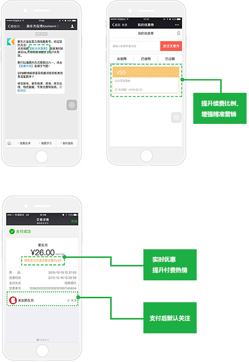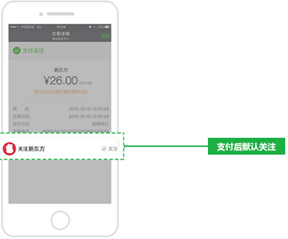 用微信支付后公众号默认推荐关注:成为公众号粉丝,便于运营活动和教学管理通知等各类信息的精确触达。