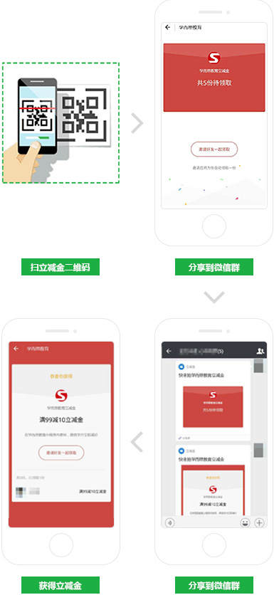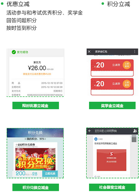 活动经费的支持学员通过微信支付,即可获得优惠券、立减金、红包等多种形式的学费减免。减免经费可为多方联合出资。