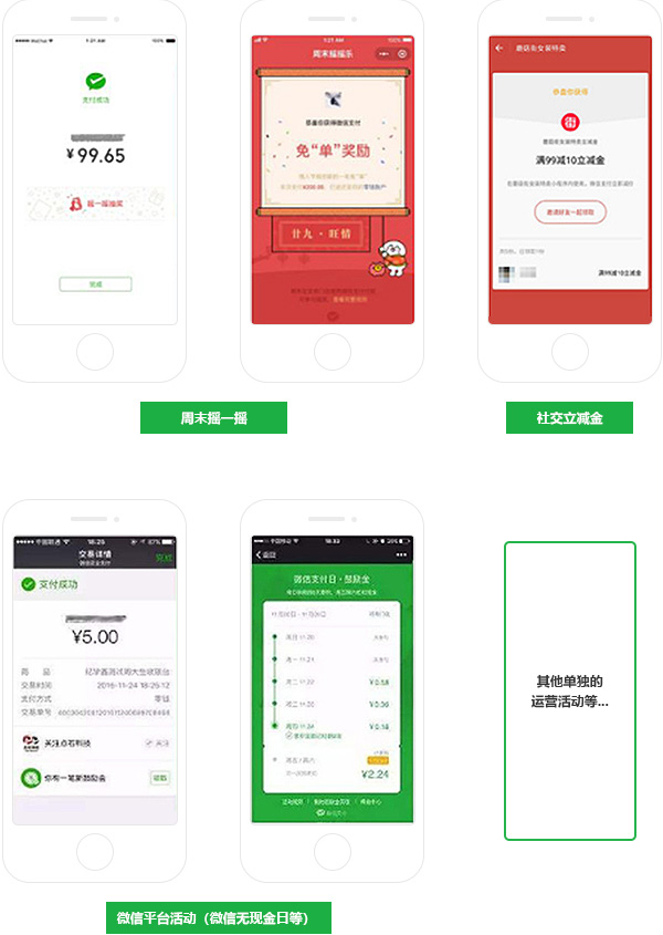 社交立减金,用户扫描机构立减金二维码,分享到微信群中,在该机构使用微信支付消费时自动抵扣现金。