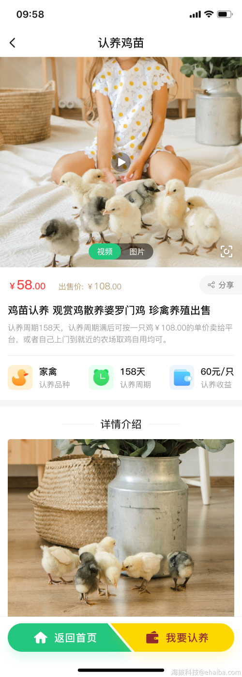 一款认养殖行业类的物联网系统,开发了鸡苗认养、平台回收寄卖功能、分销功能,用户通过智能监控在线实时观看认养的鸡苗生长、活动情况,便捷开启云种养殖生活!