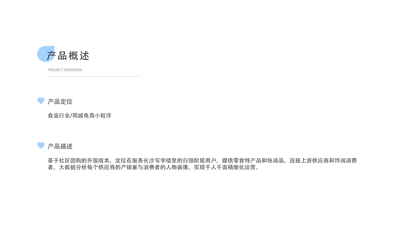 基于社区团购的升级版本,定位在服务长沙写字楼里的白领阶层用户,提供零食特产品和快消品,连接上游供应商和终端消费者,大数据分析每个供应商的产销量与消费者的人物画像,实现千人千面精细化运营。