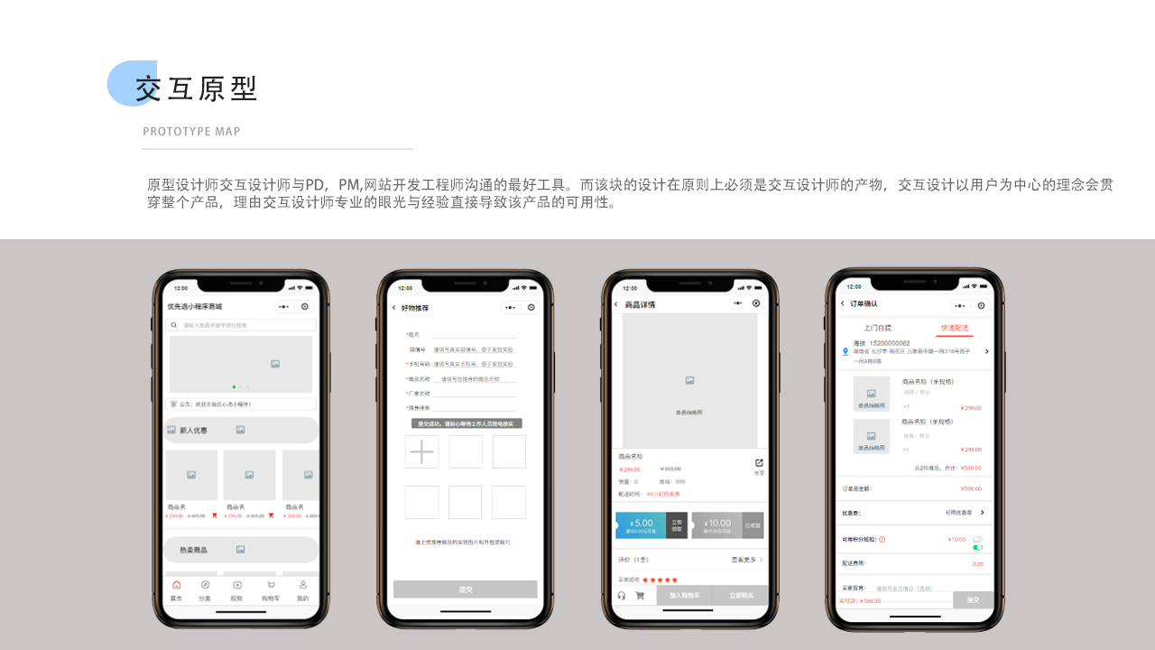 原型设计师交互设计师与PD,PM,网站开发工程师沟通的最好工具。而该块的设计在原则上必须是交互设计师的产物,交互设计以用户为中心的理念会贯穿整个产品。理由交互设计师专业的眼光与经验直接导致该产品的可用性。