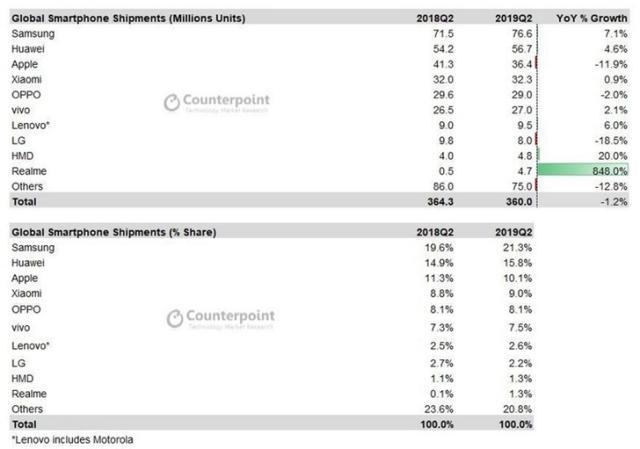 7月31日消息 Counterpoint数据显示,2019年第二季度全球智能手机出货量为3.6亿台,同比下降1.2%。 其中三星(7660万台)、华为(5670万台)、苹果(3640万台)、小米(3230万台)、OPPO(2970万台)、vivo(2700万台)排名出货量前六,此外,realme以470万台的出货量跻身全球出货量前十。其中,三星和华为均保持了不错的增长,苹果则出现了大幅的下滑。