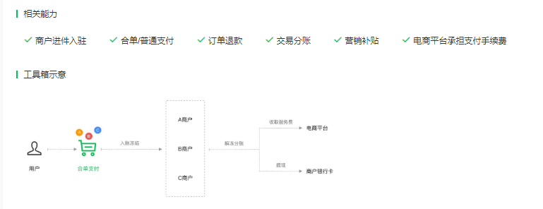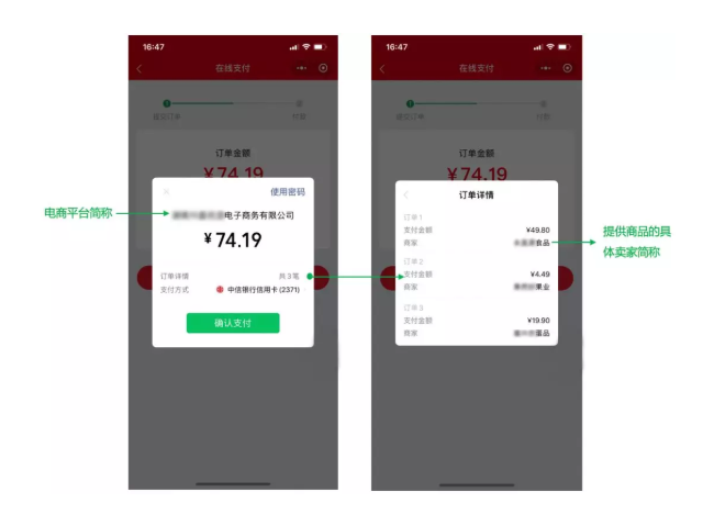 微信支付通过「电商收付通」为电商平台开放合单支付的能力:20个卖家的多种商品,用户只需一次支付。用户支付时,收银台展示电商平台简称,详情展示二级卖家简称,让用户买得放心。